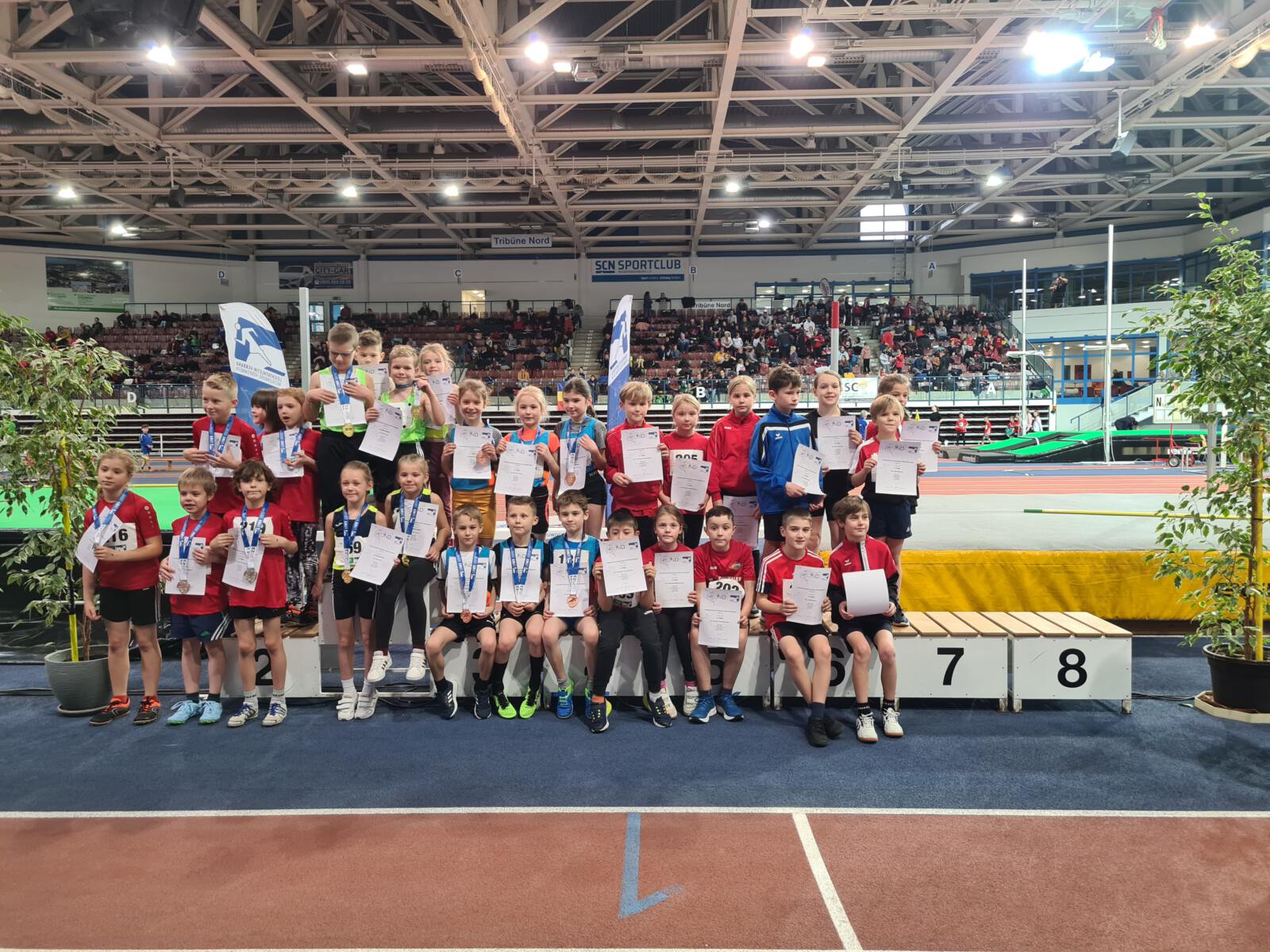 Für Felix Maximilian stand zum Abschluss noch der Hochsprung auf dem Plan, der direkt nach dem 800m-Lauf stattfand. Mit einer übersprungenen Höhe von 1,25m holte er sich in dieser Disziplin die Silbermedaille. Damit war der Wettkampf für beide Sportler doch recht erfolgreich beendet worden. Am Sonntag, den 22.01.2023 fanden die Wettkämpfe in Form eines Mehrkampfes für die U10 statt. Hier traten zunächst sechs Athleten in der 6x100m-Staffel an. Im Anschluss fand für die Kinder ein 3-Kampf, bestehend aus 50m-Sprint, Weitsprung und 800m-Lauf, statt.
